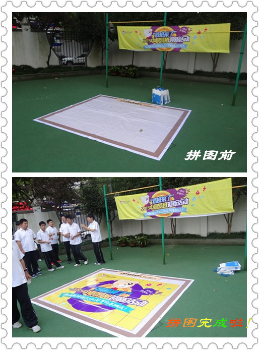 与完成拼图游戏的10名同学合影,其可爱的造型受到了同学们的喜爱。